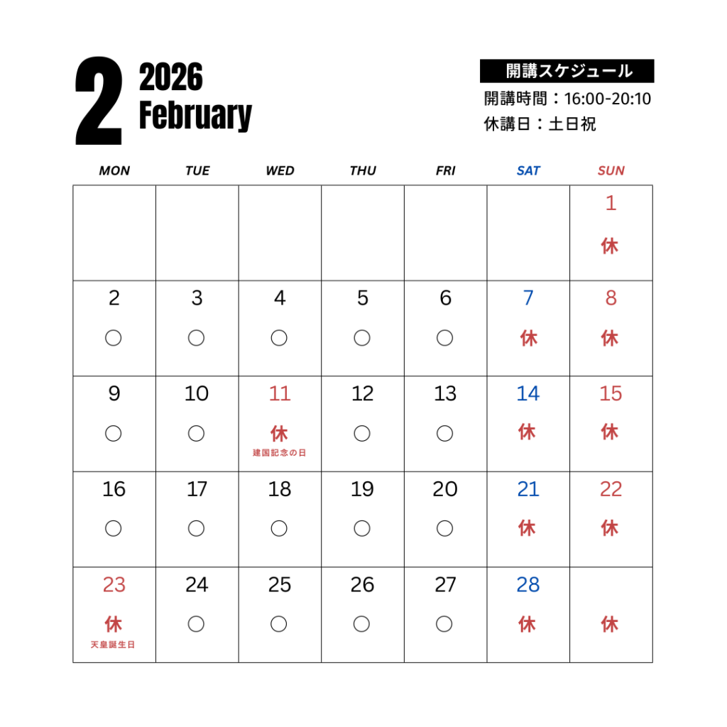1コマ60-80分授業です。満席のコマもございますので、詳しくはこちらよりお問い合わせください。